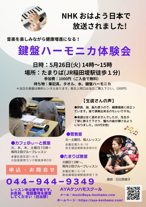 川崎市で、大人の鍵盤ハーモニカ・ケンハモ教室 (稲田堤、読売ランド)
